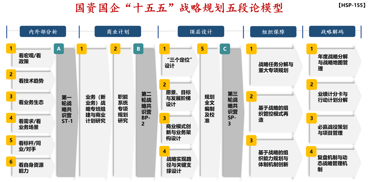 針對(duì)上述矛盾,結(jié)合本公司原創(chuàng)的國(guó)資國(guó)企十五五戰(zhàn)略規(guī)劃五段論模型(內(nèi)外部分析、商業(yè)計(jì)劃、頂層設(shè)計(jì)、組織保障、戰(zhàn)略解碼),構(gòu)建國(guó)企十五五規(guī)劃的系統(tǒng)解決方案,實(shí)現(xiàn)戰(zhàn)略引領(lǐng)、能力升級(jí)、價(jià)值創(chuàng)造的三位一體。
