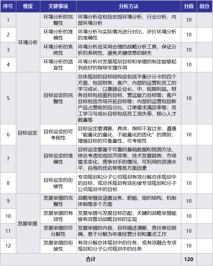 從發(fā)展環(huán)境分析、發(fā)展目標(biāo)設(shè)定、發(fā)展舉措設(shè)計(jì)三方面分析規(guī)劃制定的質(zhì)量,并細(xì)分為12個(gè)指標(biāo),每項(xiàng)指標(biāo)給予10分,結(jié)合具體情況進(jìn)行評(píng)價(jià)。
