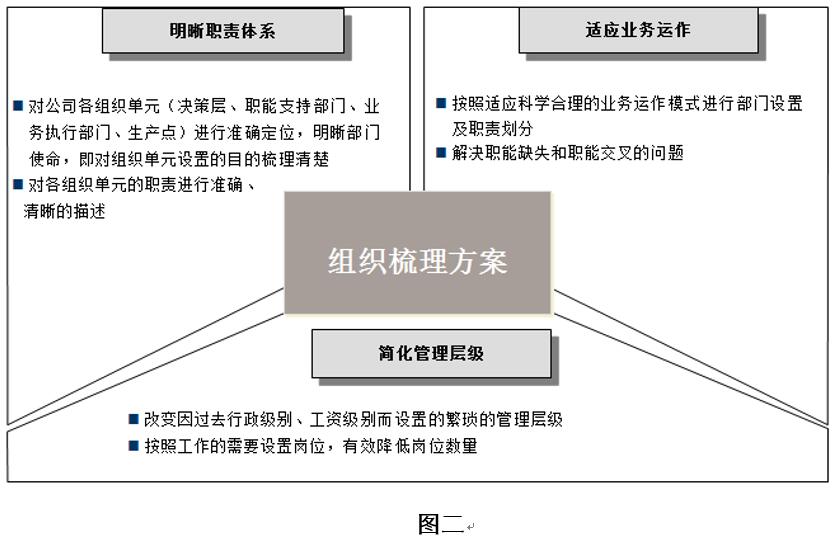 組織結(jié)構(gòu)梳理方案的設(shè)計(jì)是在現(xiàn)行組織結(jié)構(gòu)不變的情況下從三項(xiàng)關(guān)鍵內(nèi)容著手:明晰職責(zé)體系、適應(yīng)業(yè)務(wù)運(yùn)作、簡(jiǎn)化管理層級(jí)。