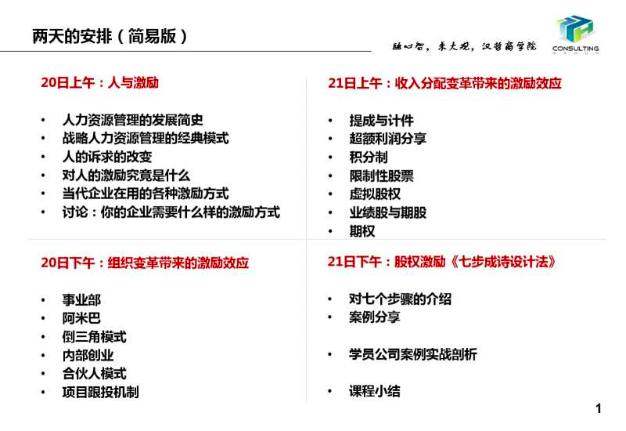 兩天的學(xué)習(xí),讓學(xué)員對(duì)于創(chuàng)新激勵(lì)有了全面的了解,掌握了包括組織激勵(lì)在內(nèi)一系列激勵(lì)方式和方法,也更加深刻地理解了股權(quán)激勵(lì)的意義、作用和適用范圍,正本清源,為學(xué)員用好、用對(duì)這一管理工具打下了良好的基礎(chǔ)。