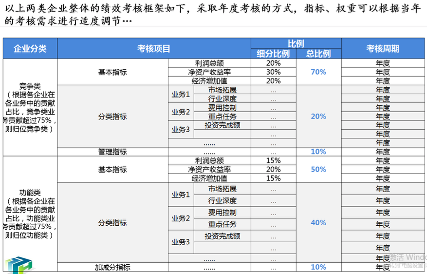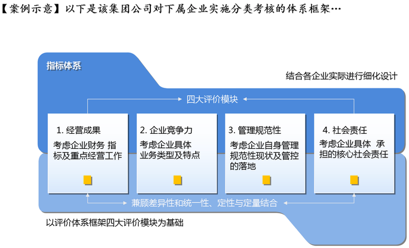 1、優(yōu)化集團(tuán)所屬子公司經(jīng)營(yíng)業(yè)績(jī)考核辦法。根據(jù)集團(tuán)戰(zhàn)略目標(biāo)和所屬子公司的功能定位、業(yè)務(wù)特點(diǎn),實(shí)行年度考核與任期考核相結(jié)合的方式,遵循依法考核、激勵(lì)與約束并重、分類考核的原則,制定子公司考核指標(biāo)、考核程序、考核計(jì)分辦法,形成所屬子公司的經(jīng)營(yíng)業(yè)績(jī)考核辦法,保護(hù)投資人的合法權(quán)益,落實(shí)資產(chǎn)保值增值責(zé)任,建立有效的激勵(lì)和約束機(jī)制,為實(shí)現(xiàn)集團(tuán)戰(zhàn)略目標(biāo)夯實(shí)堅(jiān)實(shí)的基礎(chǔ)。