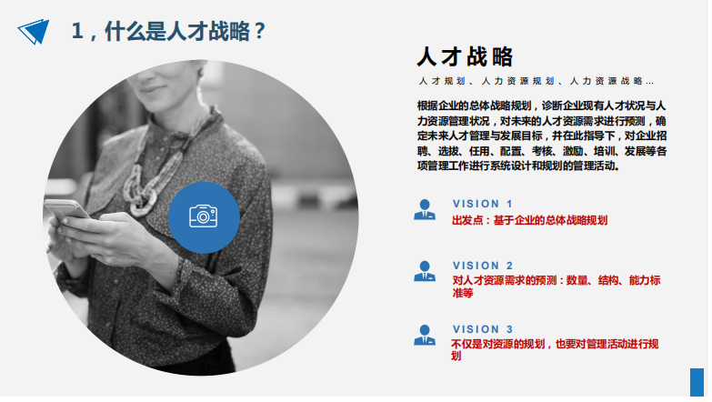 人才戰(zhàn)略,是根據(jù)企業(yè)的總體戰(zhàn)略規(guī)劃,診斷企業(yè)現(xiàn)有人才狀況與人力資源管理狀況,對(duì)未來的人才資源需求進(jìn)行預(yù)測(cè),確定未來人才管理與發(fā)展目標(biāo),并在此指導(dǎo)下,對(duì)企業(yè)招聘、選拔、任用、配置、考核、激勵(lì)、培訓(xùn)、發(fā)展等各項(xiàng)管理工作進(jìn)行系統(tǒng)設(shè)計(jì)和規(guī)劃的管理活動(dòng)。