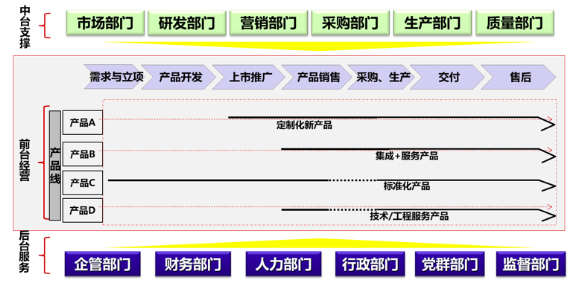 組織運(yùn)作機(jī)制可以整體概括為:前臺(tái)經(jīng)營(yíng)、中臺(tái)支撐、后臺(tái)服務(wù)。流程體系設(shè)計(jì)需要以組織架構(gòu)為基礎(chǔ)和前提,因此,項(xiàng)目組將通過行業(yè)最佳實(shí)踐、能源技術(shù)公司組織運(yùn)作模式分析,與能源技術(shù)公司中高層進(jìn)行充分研討,進(jìn)一步明確組織架構(gòu)及運(yùn)作模式。項(xiàng)目組初步認(rèn)為,能源技術(shù)公司需要建立以產(chǎn)品線為主線,中臺(tái)和后臺(tái)全力支撐產(chǎn)品,從需求立項(xiàng)、開發(fā)、上市推廣、銷售、采購(gòu)生產(chǎn)、交付、售后的全生命周期組織運(yùn)作機(jī)制,打破部門墻,建立矩陣式柔性組織體系,支撐流程的高效運(yùn)轉(zhuǎn)。