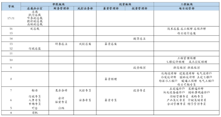 鑒于實業(yè)公司和實業(yè)公司發(fā)展基金目前發(fā)展階段的特點,由咨詢顧問進行崗位價值評價,得到《職等架構表》,職等架構重點體現(xiàn)在基金業(yè)務和項目運營管理業(yè)務上