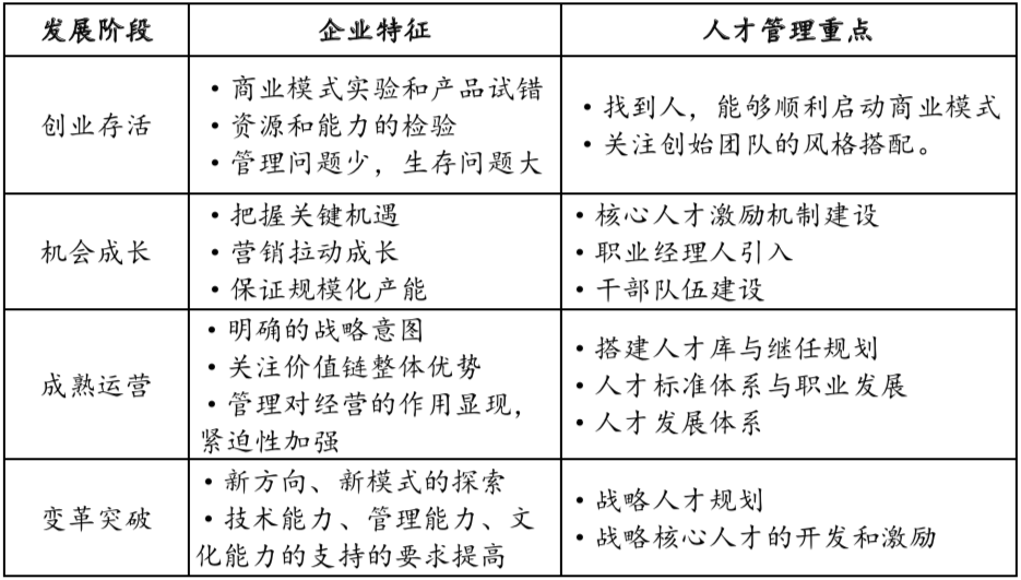 第一:保持與企業(yè)發(fā)展階段的適應(yīng)性:企業(yè)不同的發(fā)展階段,經(jīng)營(yíng)的中心不一樣,相應(yīng)人才管理所需要解決的核心問(wèn)題也就不同,借用愛(ài)迪斯的企業(yè)生命周期理論,將衰退期理解為變革轉(zhuǎn)型期的基礎(chǔ)上,將各階段人才管理的重點(diǎn)如下: