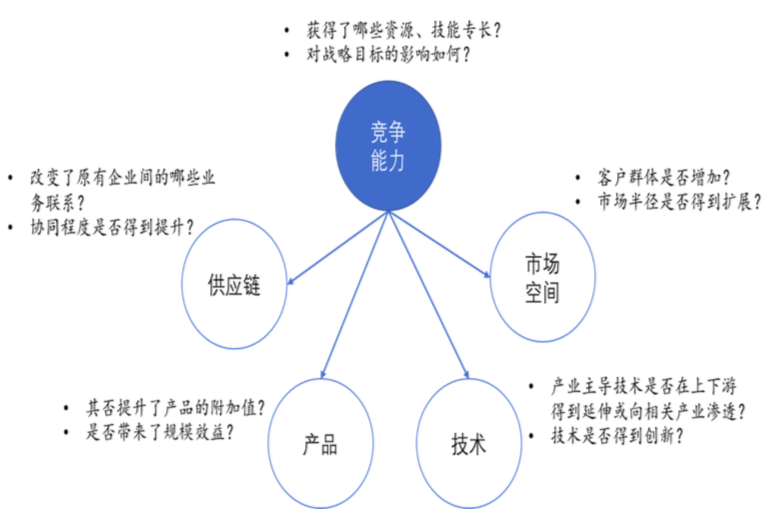 產(chǎn)業(yè)整合的相關(guān)理論研究觀點豐富,較有代表性的一是從市場的資源配置效率出發(fā)的“結(jié)構(gòu)—行為—績效”分析范式,主要考察市場集中度、進入壁壘、產(chǎn)品差別化程度等市場結(jié)構(gòu)狀況對企業(yè)價格和產(chǎn)量決策的影響;二是從交易費用理論出發(fā),以成本節(jié)約的程度與資產(chǎn)專用性程度、資產(chǎn)被利用的頻繁程度和環(huán)境的不確定程度等因素分析產(chǎn)業(yè)整合的價值;三是從企業(yè)能力理論出發(fā),解釋產(chǎn)業(yè)整合是重新調(diào)整企業(yè)間能力分布,從而帶來經(jīng)營價值的過程。各種理論多來自產(chǎn)業(yè)經(jīng)濟學的經(jīng)典理論,也不乏諾貝爾大神的加持,確實帶來很多有益的啟示,漢哲從經(jīng)典理論研究和咨詢實踐出發(fā),提出了“1+4”產(chǎn)業(yè)整合評估模型,既一個核心,企業(yè)競爭能力得到了哪些增值,四個影響維度,從供應(yīng)鏈、產(chǎn)品、技術(shù)、市場空間具體分析產(chǎn)業(yè)整合所帶來的預(yù)期增值是什么。其中,企業(yè)產(chǎn)業(yè)整合的核心是競爭能力的提升,以解決戰(zhàn)略實現(xiàn)的過程性問題,因此需要從戰(zhàn)略任務(wù)和外部市場環(huán)境的角度對并購的價值做出考量,同時,所有的產(chǎn)業(yè)并購行為,必然帶來產(chǎn)業(yè)鏈的具體變化,而這些變化也將成為競爭能力提升的具體外延,變化的程度和質(zhì)量則直接決定競爭能力增值實現(xiàn)的多少。