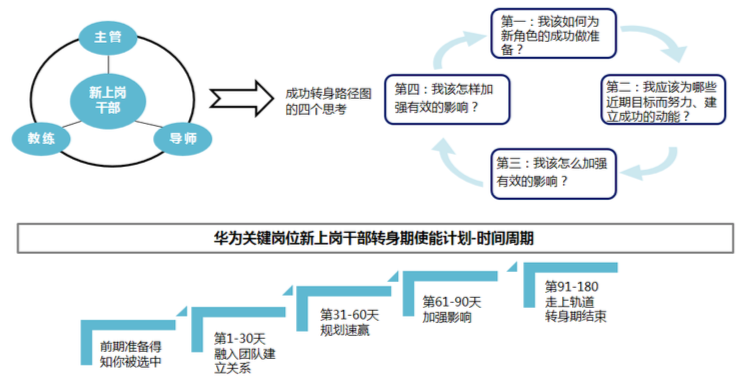 對(duì)于關(guān)鍵崗位的干部,如果管理跨度比較大,華為還會(huì)單獨(dú)為他們做新干部上崗的90天轉(zhuǎn)身輔導(dǎo)計(jì)劃。