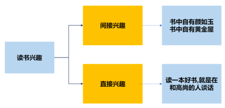 間接興趣是相對于直接興趣而言的。簡而言之,間接興趣是對結(jié)果的興趣,直接興趣是對過程的興趣。打個比方,爸爸和孩子在海灘邊玩泥巴,兩個人都很開心。小孩開心,是因為對在泥巴的搓捏和變形過程中感受到的探索和控制的快感。爸爸開心,是因為小孩玩的很開心他也很開心。小孩的這種開心就是純粹的直接興趣,爸爸的這種開心就是間接興趣。同樣,如圖1所示,同樣是喜歡讀書,讀書的直接興趣和間接興趣差異也很大。