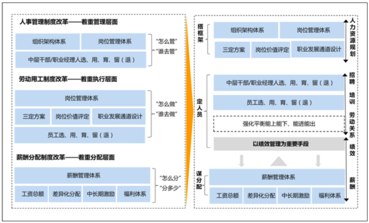 通過人力資源管理的六大模塊,我們將三項制度改革的相關(guān)內(nèi)容進行解構(gòu),以人力資源管理的邏輯對三項制度改革進行二次解讀,使三項制度改革的邏輯更加清晰。
