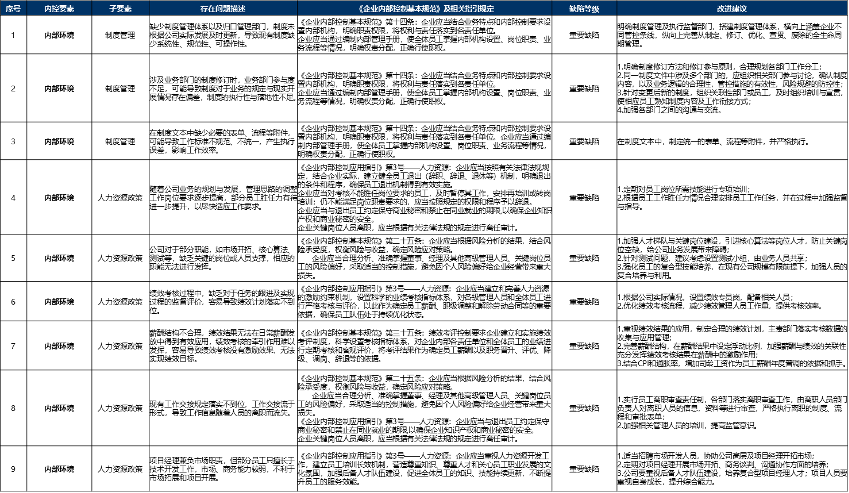 4、依據(jù)財政部等五部委發(fā)布的《企業(yè)內(nèi)部控制基本規(guī)范》及配套指引,結(jié)合公司實際情況、訪談內(nèi)容及制度評閱情況等,從組織架構(gòu)、發(fā)展戰(zhàn)略、人力資源、社會責(zé)任等各個方面對公司的內(nèi)部控制缺陷進(jìn)行了梳理,建立內(nèi)部控制缺陷列表,并對缺陷進(jìn)行問題描述、等級評定;