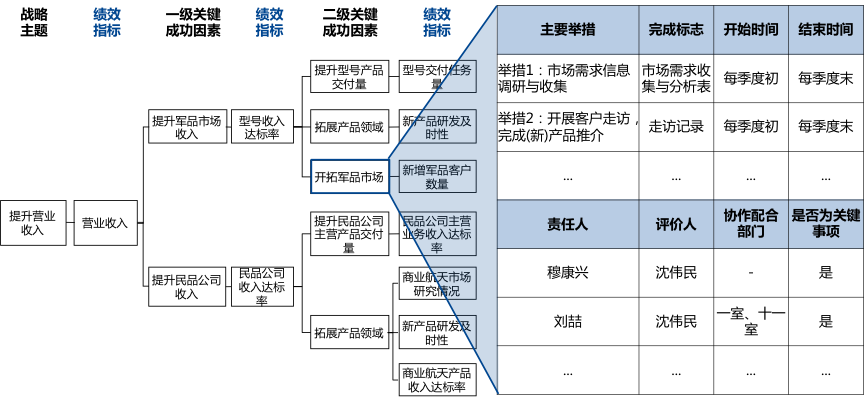 圍繞關(guān)鍵成功因素,制定實(shí)現(xiàn)關(guān)鍵成功因素的行動(dòng)計(jì)劃。行動(dòng)計(jì)劃是把關(guān)鍵成功因素轉(zhuǎn)化為具體、可實(shí)施的行動(dòng)舉措,并明確行動(dòng)舉措的完成時(shí)間、完成標(biāo)志及責(zé)任人。行動(dòng)計(jì)劃一方面可將結(jié)果性指標(biāo)分解、細(xì)化為具體工作任務(wù),作為過程指標(biāo),使指標(biāo)兼顧過程和結(jié)果;另一方面可將部門工作任務(wù)落實(shí)到人,為崗位考核提供基礎(chǔ),實(shí)現(xiàn)組織目標(biāo)的層層落地。