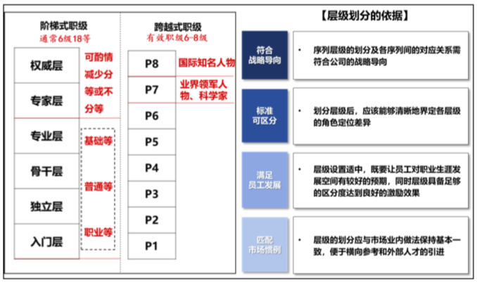 當(dāng)然,除參考市場經(jīng)驗外,企業(yè)還需要考慮內(nèi)部實際情況,尤其是各序列實際情況來進行層級劃分。專業(yè)壁壘、戰(zhàn)略重要性差異較大的序列在層級劃分上也會有一定區(qū)別。