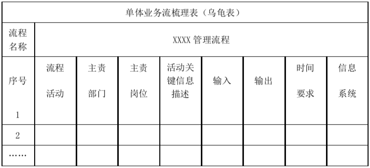 運用烏龜表顯化工具,將單體業(yè)務(wù)流的要素信息進行整理、呈現(xiàn),以用于單體業(yè)務(wù)流的分析及改進。以下表2是烏龜表顯化工具模板: