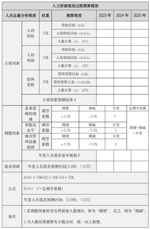公司的人員需求規(guī)劃模型由三個(gè)主要因素和三個(gè)調(diào)整因素兩部分構(gòu)成。主要因素包括人均營收、人均利潤、管網(wǎng)里程;調(diào)整因素包括業(yè)務(wù)范疇的增減、智能化水平、城市管網(wǎng)設(shè)施基礎(chǔ)。
