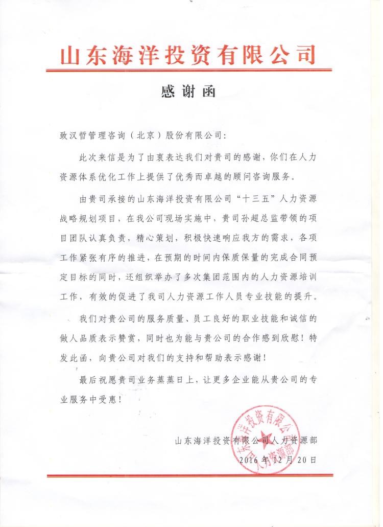 項目完成之際,山東海洋集團(tuán)向漢哲咨詢發(fā)來感謝函,就漢哲咨詢的項目貢獻(xiàn)表示感謝。這也標(biāo)志著漢哲咨詢在人力資源規(guī)劃領(lǐng)域,又完成了一項標(biāo)桿式咨詢案例。