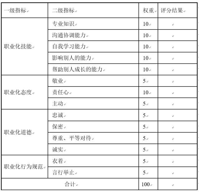根據(jù)職業(yè)化的內(nèi)涵,我們?yōu)槠髽I(yè)的人力資源管理者初步確定了職業(yè)化技能、職業(yè)化態(tài)度、職業(yè)化道德和職業(yè)化行為規(guī)范四個一級評價維度,在此基礎(chǔ)上,開發(fā)了針對HRM的二級評價指標,并賦予了相應的權(quán)重,如下表所示: