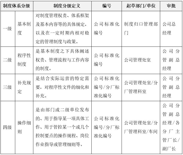 (1)基本制度:包括對(duì)制度管理權(quán)責(zé)、制度體系框架及基本內(nèi)容等的規(guī)定,以及在一定時(shí)期內(nèi)相對(duì)穩(wěn)定的、具有戰(zhàn)略性、全局性、綜合性的管理制度與政策。