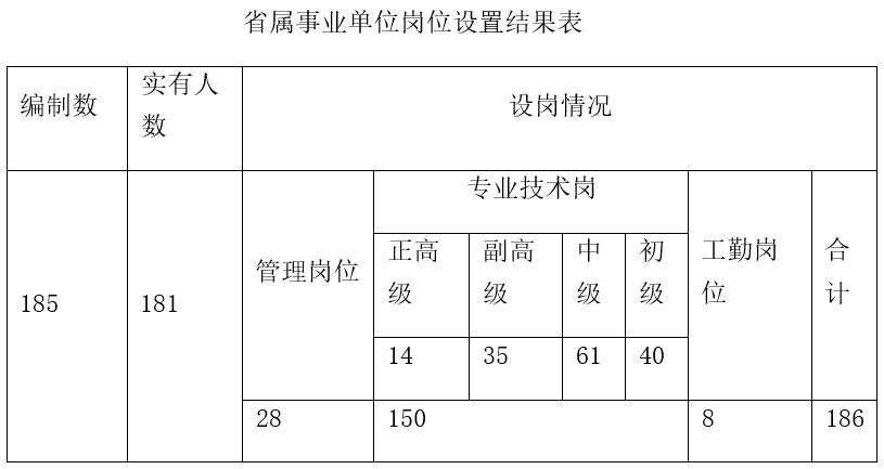 藥監(jiān)系統(tǒng)的事業(yè)單位崗位設(shè)置工作,歷時(shí)半年,全部完成崗位設(shè)置和審批工作,主要結(jié)果如下:96個(gè)事業(yè)單位中,除省屬信息培訓(xùn)中心外,全部確認(rèn)為以專業(yè)技術(shù)人員為主體,管理崗位和工勤技能崗位為輔。全系統(tǒng)共設(shè)崗1252個(gè),其中管理崗位89個(gè),專業(yè)技術(shù)崗位1048個(gè),工勤技能崗位115個(gè)。省、市、縣三級(jí)藥監(jiān)機(jī)構(gòu)各類崗位具體分布情況見(jiàn)下表: