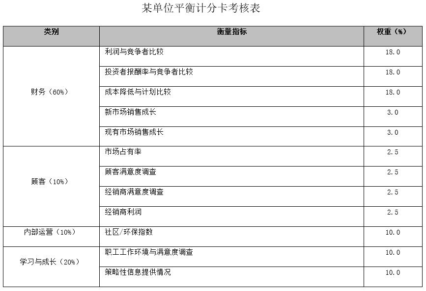 平衡計分卡是卡普蘭和諾頓在總結(jié)了十二家大型單位的業(yè)績評價體系的成功經(jīng)驗的基礎(chǔ)上提出的。平衡計分卡是一種戰(zhàn)略性人力資源管理思想和指導方法。平衡計分卡的倡導者認為在制定單位發(fā)展戰(zhàn)略目標時,不能只考慮財務指標,而應該考慮支撐單位財務指標實現(xiàn)的其他方面:關(guān)注客戶、業(yè)務流程、學習與成長等。由此,平衡計分卡考核指標可以從多個維度構(gòu)建,但是較為普遍的是從財務維度、客戶維度、內(nèi)部流程維度、學習和創(chuàng)新維度進行考慮。