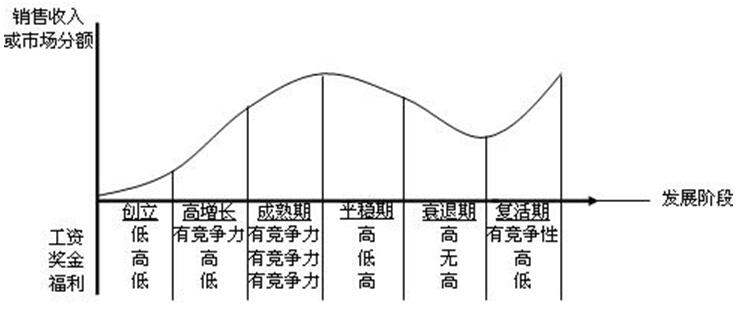 在實(shí)際應(yīng)用中,一般都是績(jī)效薪酬和基本薪酬各占一定的比例。當(dāng)兩者比例不斷調(diào)和變化時(shí),這種薪酬模型可以演變?yōu)橐约?lì)為主的模型,也可以演變?yōu)橐苑€(wěn)定為主的薪酬模型。伴隨著組織的發(fā)展,不同的發(fā)展階段薪酬結(jié)構(gòu)策略也是不盡相同的,如以下圖表所示: