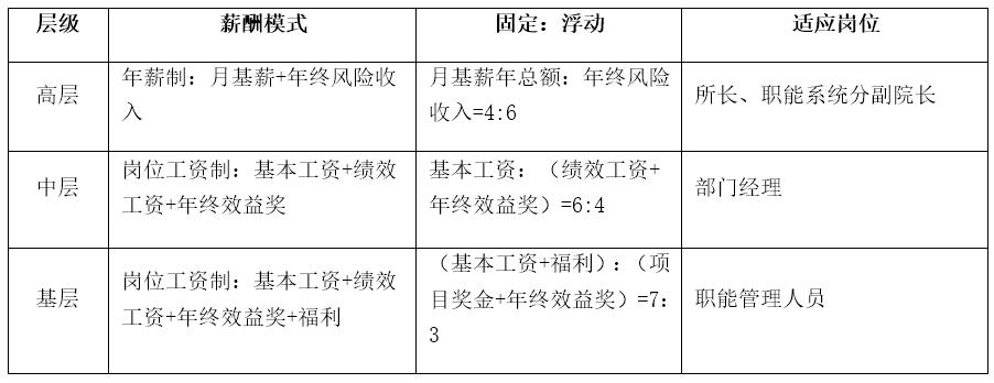 根據(jù)職能人員的管理層級(jí)不同,薪酬收入中的固定部分(基本工資)和浮動(dòng)工資(績(jī)效工資、年終效益獎(jiǎng))的分配比例進(jìn)行不同設(shè)置:
