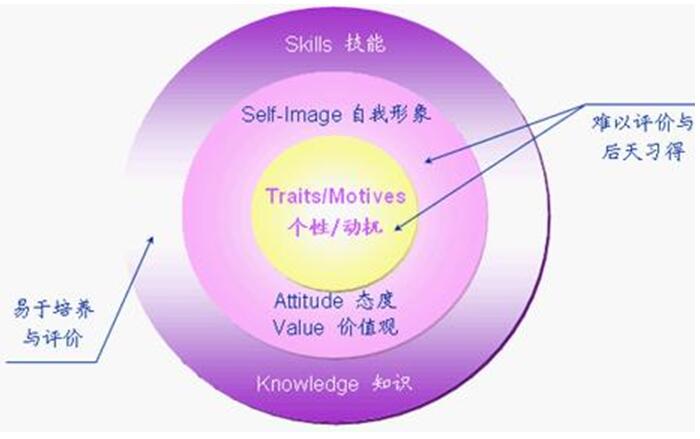 素質(zhì)洋蔥模型中的各核心要素由內(nèi)至外分別是動機(jī)、個性、自我形象與價值觀、社會角色、態(tài)度、知識、技能等。