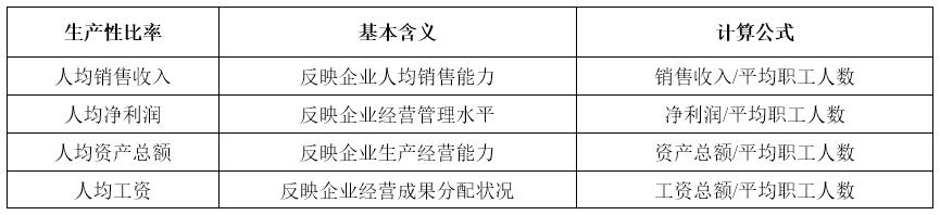 生產(chǎn)性指標(biāo)分析的目的是判斷企業(yè)在一定時期內(nèi)的生產(chǎn)經(jīng)營能力、生產(chǎn)經(jīng)營水平和生產(chǎn)成果分配等,主要指標(biāo)如表5所示。